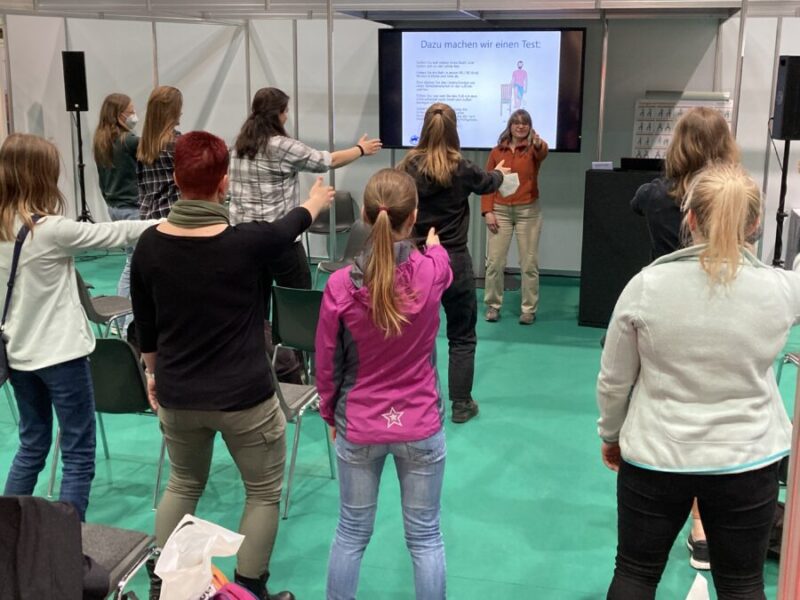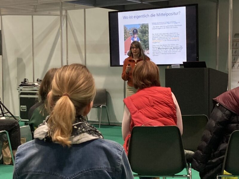So konnte ich viele gute Gespräche führen und freue mich darüber, dass so viele Reiter wissen, dass das A und O für gesundes Reiten ein guter Sitz ist. Es ist wirklich spannend, aus unterschiedlichen Blickwinkeln zu schauen, wer seine Baustellen wie angeht. Denn dass jeder eine in seinem Körper hat, wissen viele Reiter. Mein Vortrag „Der Weg zu einer lockeren Mittelpositur“ wurde oft gehört und gut angenommen. Auch mein Buch „Besser reiten trotz Hüftbeschwerden“ wurde auch von jüngeren Reitern angeschaut und auch gekauft. Das freut mich besonders, das mein Baby jetzt den Kinderschuhen entwachsen ist und seinen Weg geht!